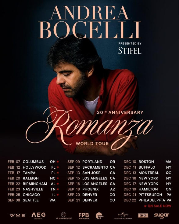 Produced by AEG Presents, the 2026 Romanza 30th Anniversary Tour will see Bocelli perform in iconic venues across the world, including his return to Madison Square Garden for two nights in New York City, The Hollywood Bowl in Los Angeles, Red Rocks Amphitheatre in Denver, CO, Bell Centre in Montreal, QC, TD Garden in Boston, and more. Internationally, the tour will see Bocelli perform in Aguascalientes, Mexico, Venice, Italy, Gdansk and Warsaw, Poland, and Vienna, Austria.