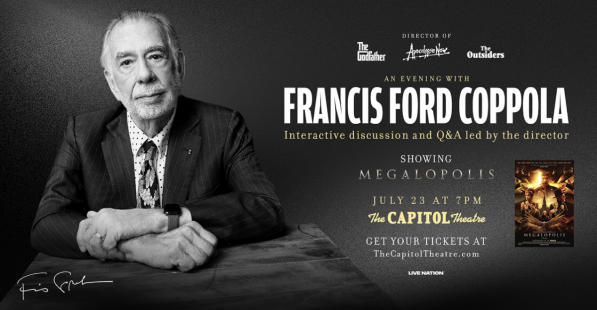 Legendary director, Francis Ford Coppola (The Godfather, Apocalypse Now, The Outsiders) is bringing his monumental 2024 film, MEGALOPOLIS, to select cities across the country. This exclusive event offers a rare chance to experience the film as it was meant to be seen—on the big screen, surrounded by a live audience. Following the screening, Coppola will lead an interactive conversation about the future of humanity, along with a live audience Q&A. Don’t miss this one-of-a-kind opportunity to see MEGALOPOLIS —not currently available on streaming—and engage with the iconic director live.