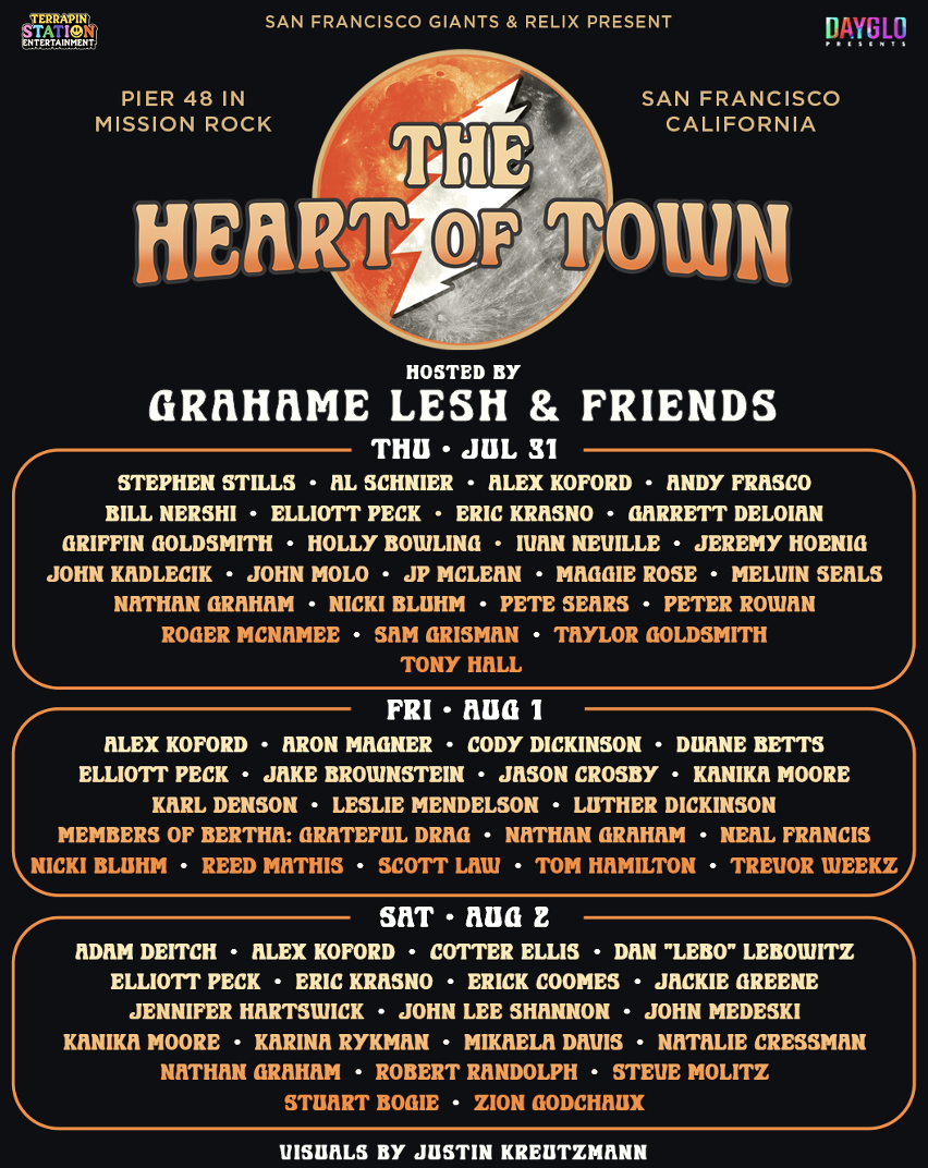 Monday, August 4 — This weekend, the San Francisco Giants and Relix teamed up to present The Heart of Town, a special three-night concert series celebrating the Grateful Dead’s 60th anniversary and the enduring spirit of San Francisco. Hosted by Grahame Lesh & Friends, the shows took place July 31–August 2 at Pier 48 in Mission Rock, located just steps from Oracle Park.