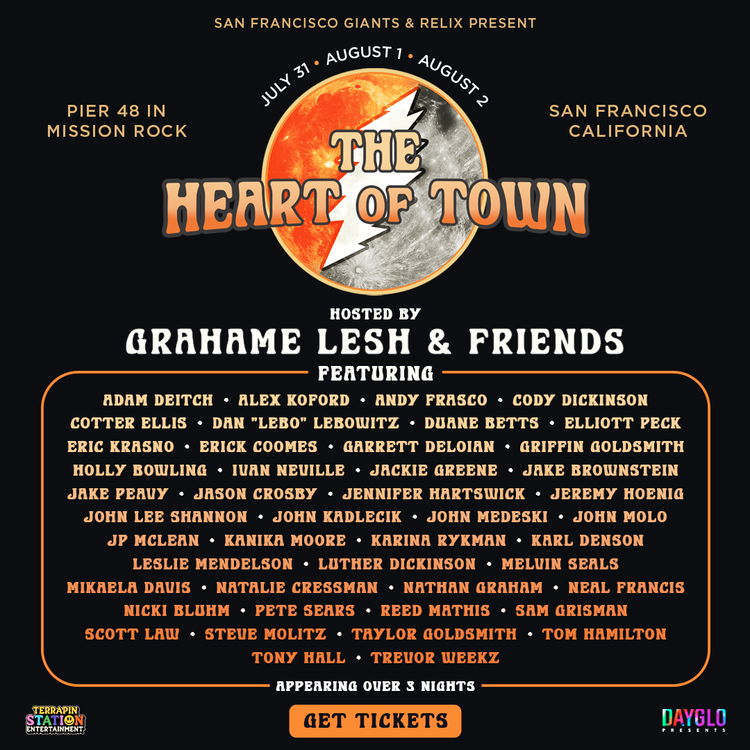 Thursday, June 26 — The San Francisco Giants and Relix are teaming up to present The Heart of Town, a special three-night concert series celebrating the Grateful Dead’s 60th anniversary and the enduring spirit of San Francisco. Hosted by Grahame Lesh & Friends, the shows will take place July 31–August 2 at Pier 48 in Mission Rock, located just steps from Oracle Park.