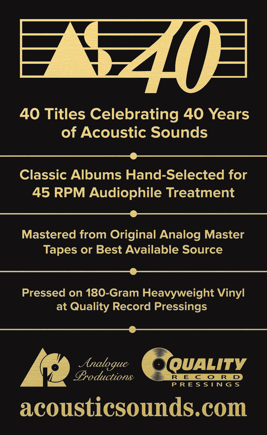 Analogue Productions and Quality Record Pressings proudly present 40 titles celebrating 40 years of Acoustic Sounds and audiophile perfection.