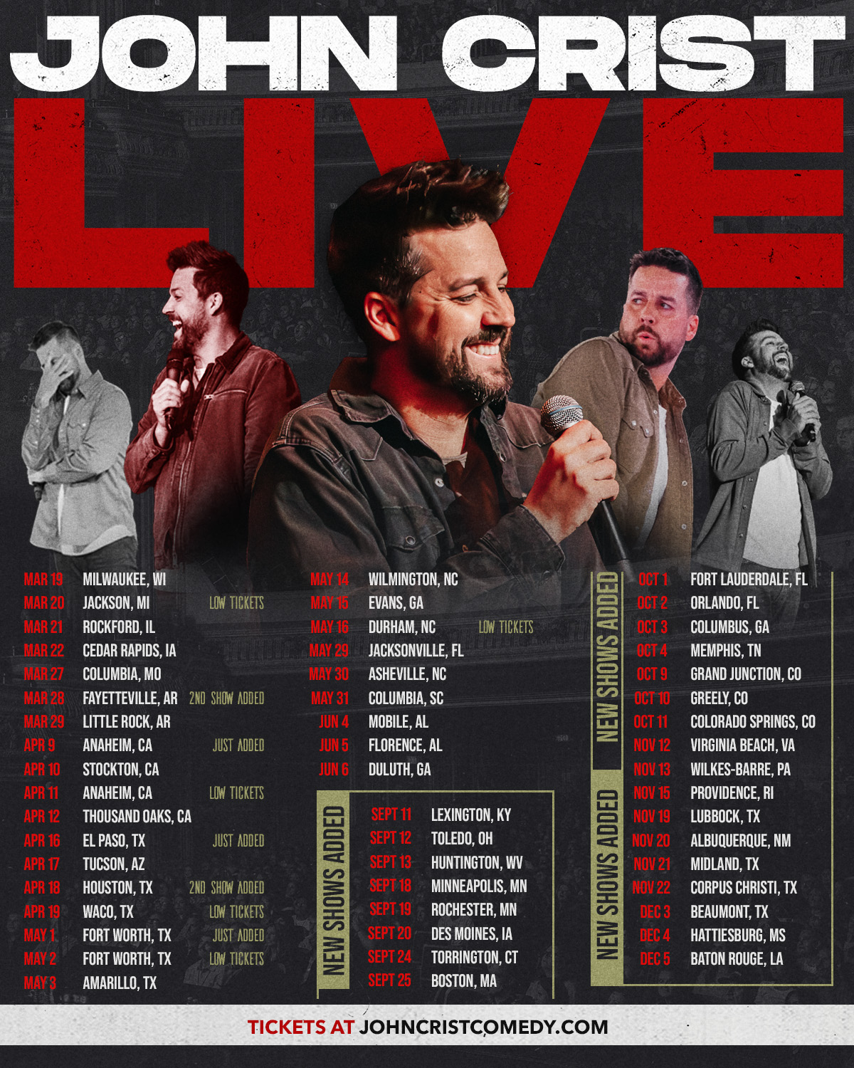 JOHN CRIST LIVE!: Thu., Mar. 19 | The Pabst Theater | Milwaukee, WI Fri., Mar. 20 | The Michigan Theatre of Jackson | Jackson, MI Sat., Mar. 21 | Coronado Performing Arts Center | Rockford, IL Sun., Mar. 22 | Paramount Theatre | Cedar Rapids, IA Fri., Mar. 27 | Missouri Theatre | Columbia, MO Sat., Mar. 28 | Walton Arts Center | Fayetteville, AR* Sun., Mar. 29 | Robinson Performance Hall | Little Rock, AR Thu., Apr. 9 | The Grove of Anaheim | Anaheim, CA Fri., Apr. 10 | Bob Hope Theatre | Stockton, CA Sat., Apr. 11 | The Grove of Anaheim | Anaheim, CA* Sun., Apr. 12 | Fred Kavli Theatre | Thousand Oaks, CA Thu., Apr. 16 | UTEP Magoffin Auditorium | El Paso, TX Fri., Apr. 17 | The Linda Ronstadt Music Hall | Tucson, AZ Sat., Apr. 18 | Cullen Performance Hall | Houston, TX* Sun., Apr. 19 | Waco Hall | Waco, TX Fri., May 1 | Will Rogers Memorial Auditorium | Fort Worth, TX Sat., May 2 | Will Rogers Memorial Center | Fort Worth, TX Sun., May 3 | Civic Center Auditorium | Amarillo, TX Thu., May 14 | Wilson Center at Cape Fear Community College | Wilmington, NC Fri., May 15 | Columbia County Performing Arts Center | Evans, GA Sat., May 16 | Durham Performing Arts Center | Durham, NC Fri., May 29 | Florida Theatre | Jacksonville, FL Sat., May 30 | Thomas Wolfe Auditorium | Asheville, NC Sun., May 31 | Koger Center for the Arts – Gonzales Hall | Columbia, SC Thu., Jun. 4 | Saenger Theatre | Mobile, AL Fri., Jun. 5 | Norton Auditorium | Florence, AL Sat., Jun. 6 | Gas South Arena | Duluth, GA Fri., Sept. 11 | Otis A. Singletary Center for the Arts | Lexington, KY Sat., Sept. 12 | The Stranahan | Toledo, OH Sun., Sept. 13 | Keith-Albee Theatre | Huntington, WV Fri., Sept. 18 | State Theatre | Minneapolis, MN Sat., Sept. 19 | Mayo Civic Center | Rochester, MN Sun., Sept. 20 | Hoyt Sherman Place | Des Moines, IA Thu., Sept. 24 | Warner Theatre | Torrington, CT Fri., Sept. 25 | Boch Center Shubert Theatre | Boston, MA Thu., Oct. 1 | Au-Rene Theater | Fort Lauderdale, FL Fri., Oct. 2 | Hard Rock Live | Orlando, FL Sat., Oct. 3 | RiverCenter for the Performing Arts | Columbus, GA Sun., Oct. 4 | Orpheum Theatre | Memphis, TN Fri., Oct. 9 | The Avalon Theatre | Grand Junction, CO Sat., Oct. 10 | Union Colony Civic Center | Greeley, CO Sun., Oct. 11 | Pikes Peak Center | Colorado Springs, CO Thu., Nov. 12 | Sandler Center for the Performing Arts | Virginia Beach, VA Fri., Nov. 13 | F.M. Kirby Center for the Performing Arts | Wilkes-Barre, PA Sun., Nov. 15 | The VETS | Providence, RI Thu., Nov. 19 | Buddy Holly Hall | Lubbock, TX Fri., Nov. 20 | Popejoy Hall | Albuquerque, NM Sat., Nov. 21 | Wagner Noel Performing Arts Center | Midland, TX Sun., Nov. 22 | Selena Auditorium at Hillard Center | Corpus Christi, TX Thu., Dec. 3 | Jefferson Theatre | Beaumont, TX Fri., Dec. 4 | Saenger Theater | Hattiesburg, MS Sat., Dec. 5 | River Center Theatre | Baton Rouge, LA BOLD denotes newly-announced Fall dates * denotes multiple showtimes