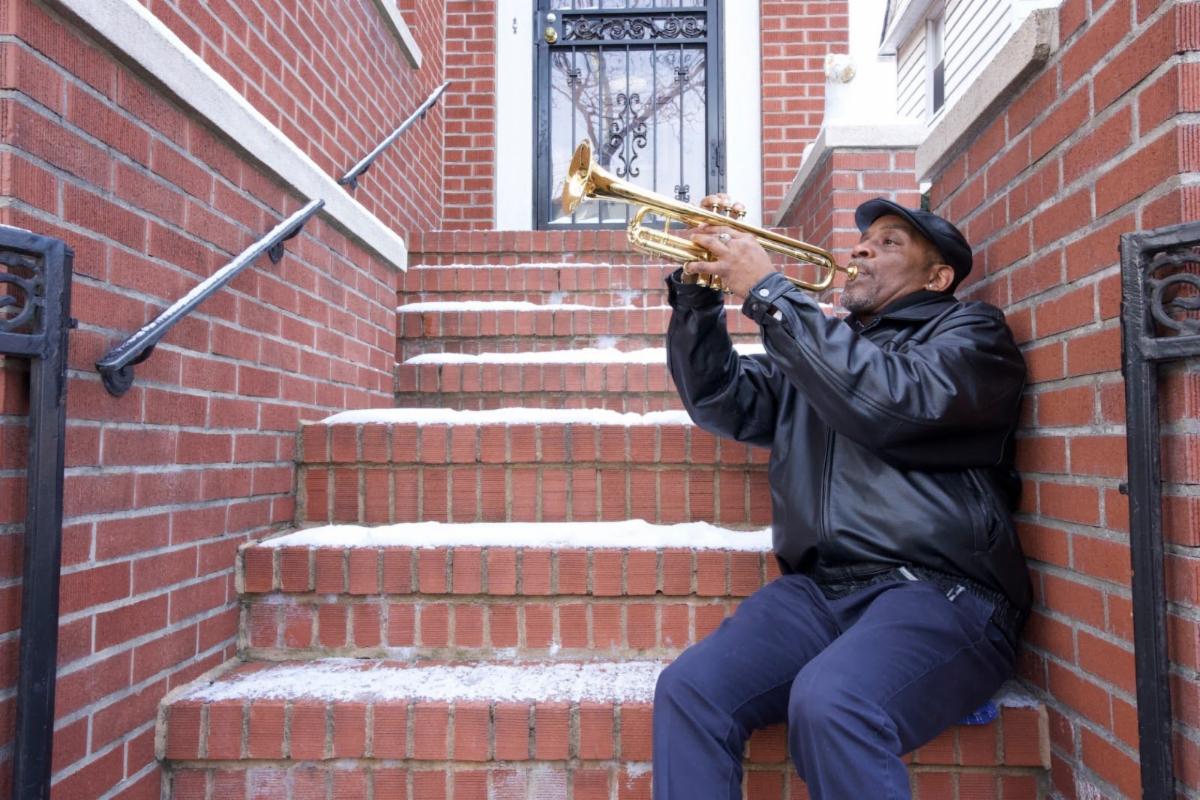 Willie Johnson on the Armstrong stoop, the very same he sat on as a child, playing Louis’s Trumpet, January 2025. Photo credit: Austin Kruczek.