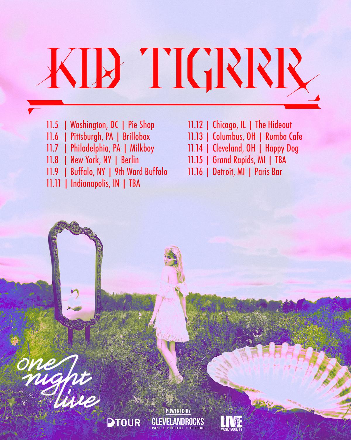 September 16, 2025 – One Night Live, a collaborative touring initiative created to provide crucial support for emerging artists and small independent venues, returns this fall for its second tour. Headlined by Cleveland-based artist Kid Tigrrr (Jenna Fournier), the 11-date run kicks off November 5 at Pie Shop in Washington, D.C. and travels through November 16 with stops across the Northeast, including New York and Philadelphia. The tour comes in support of Kid Tigrrr’s debut album, Stoned + Animald.