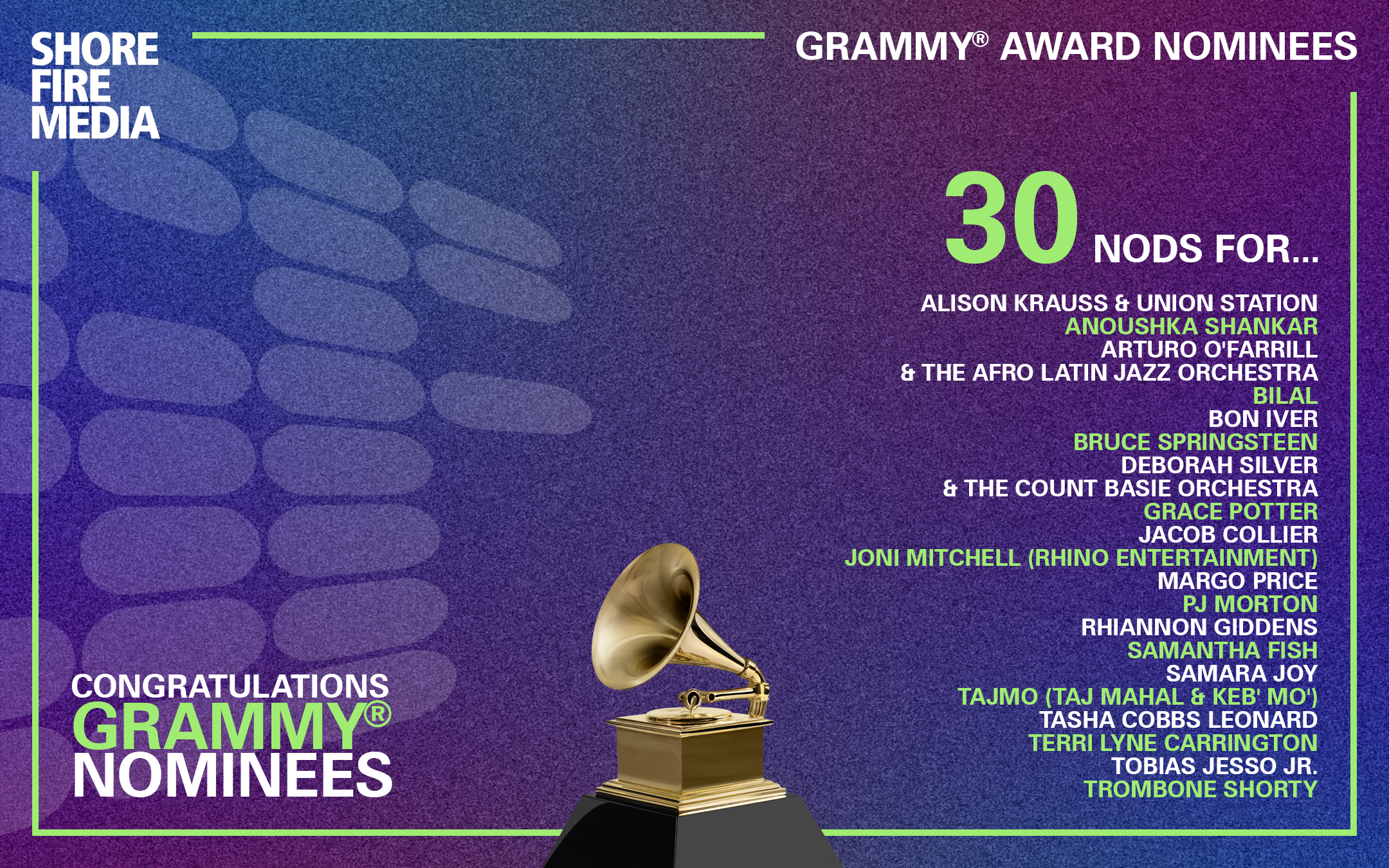 Several other Shore Fire clients were nominated for awards at the 2026 GRAMMYs as well: Bilal for Best Progressive R&B Album; Bruce Springsteen for Best Recording Package; Deborah Silver & The Count Basie Orchestra for Best Large Jazz Ensemble Album; Grace Potter for Best Americana Performance; Jacob Collier for Best Arrangement, Instruments and Vocals; Joni Mitchell (Rhino Entertainment) for Best Historical Album; Rhiannon Giddens for Best Folk Album; Samantha Fish for Best Contemporary Blues Album; TajMo (Taj Mahal & Keb' Mo') for Best Traditional Blues Album; Terri Lyne Carrington for Best Jazz Vocal Album; and Trombone Shorty for Best Regional Roots Music Album.