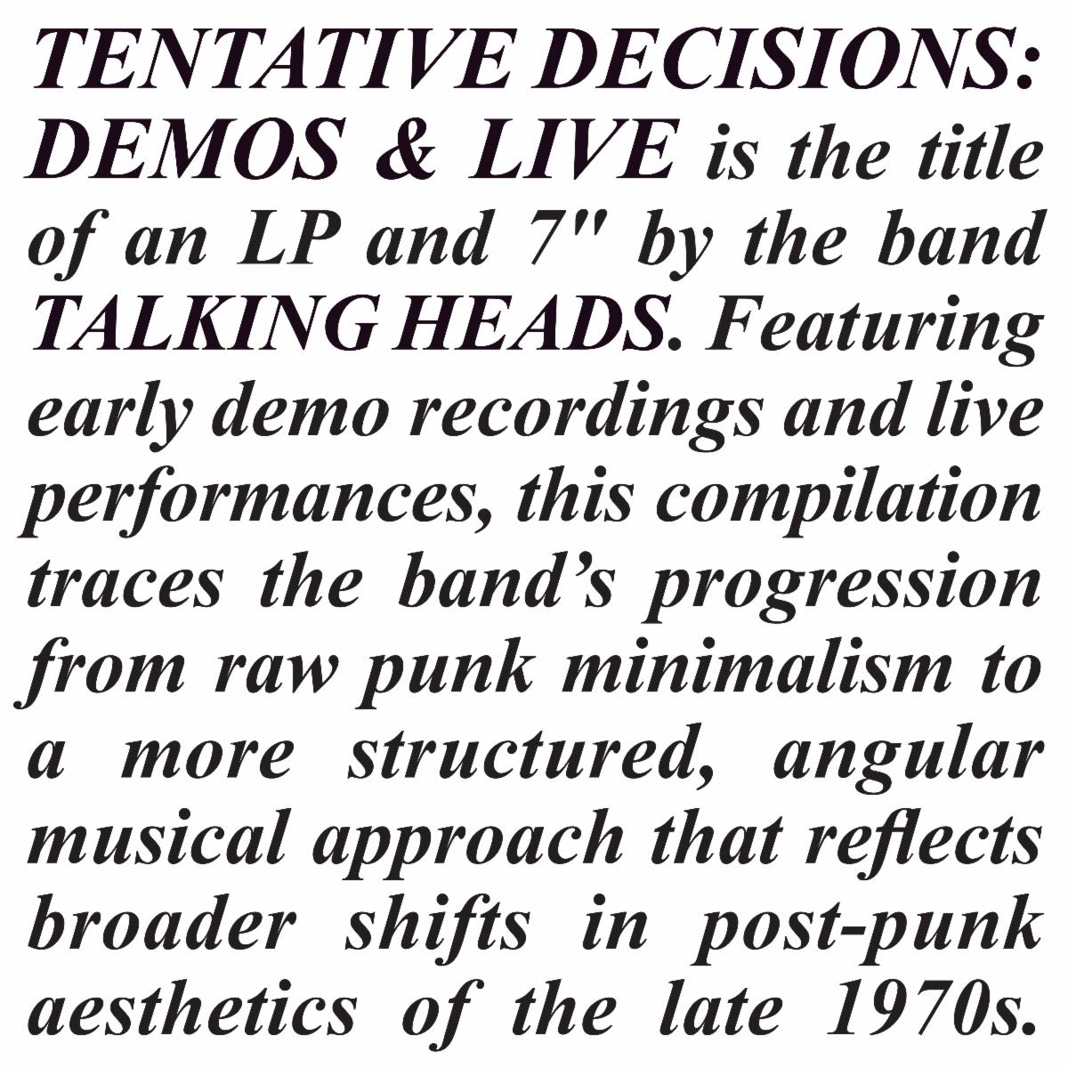 Tentative Decisions: Demos & Live continues a series of archival releases launched last year as Talking Heads began celebrating the band’s 50th anniversary. One of the most influential groups of their era, Talking Heads helped shape modern music and expand the creative possibilities of the music video—most recently with the premiere of a new “Psycho Killer” video directed by Mike Mills and starring Saoirse Ronan.