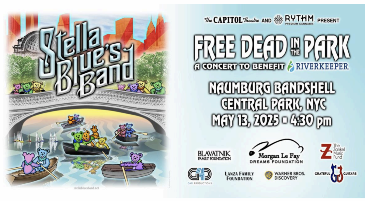 (New York, NY – March 27, 2025) – Stella Blue’s Band is excited to announce the sixth annual Free Dead in the Park concert to benefit Riverkeeper, presented by The Capitol Theatre and RYTHM Premium Cannabis. Following in the footsteps of the Grateful Dead more than 50 years ago, Stella will take to the same stage at the Naumburg Bandshell in Central Park in New York City at 4:30pm on Tuesday, May 13, for two sets of music to raise awareness and funds to help clean up and protect the Hudson River and its ecosystem. “We’re thrilled to continue this annual tradition of supporting Free Dead in the Park and Riverkeeper and bringing together the power of good music and collective action for the environment in the heart of New York City,” said Peter Shapiro, owner of The Capitol Theatre. Free Dead in the Park began in 2018 when Stella Blue’s Band first played in the bandshell to commemorate the 50th anniversary of the Grateful Dead’s epic free concert there with Jefferson Airplane and the Paul Butterfield Blues Band. In the years following, the show has grown to become a major event for Riverkeeper and its mission to protect, clean up, and advocate for the Hudson River and surrounding ecosystems. “RYTHM is thrilled to continue our support for Riverkeeper to bring back another Free Dead in the Park. Uplifting communities through music is in RYTHM's DNA. We are proud to protect the Hudson River while honoring one of the greatest bands of all time,” said Ben Kovler, Founder, Chairman and Chief Executive Officer of Green Thumb Industries, a leading national cannabis consumer packaged goods company and producer of RYTHM Premium Cannabis. Stella Blue’s Band will have the honor to play Jerry Garcia’s famous Alligator Fender Stratocaster and Bob Weir’s Modulus Blackknife guitars on stage at this show. The band thanks Grateful Guitars for the opportunity to showcase these pieces of music history. "Free Dead in the Park is a powerful reminder that music and community can come together to protect the vital resources we all rely on. Just as the Grateful Dead's legacy brought people together to celebrate life, we come together to ensure the future of the Hudson River and the countless people who depend on it,” said Tracy Brown, Riverkeeper President. “I'm so grateful to the artists, sponsors, and attendees for helping us continue this important work." An exclusive commemorative T-shirt featuring a photo of Jerry Garcia taken by photographer Jay Blakesberg (www.blakesberg.com) will be given to everyone who becomes a Riverkeeper member at the event. The band is grateful to Jerry Garcia’s management team for permission to use this historic photo. “We couldn’t do this without an army of good-hearted people who support the music and the environment,”said Steve Liesman, the band’s rhythm guitar player, a member of Riverkeeper’s board, and the senior economics reporter for CNBC. “From the folks at NYC Parks to our sponsors and fans, the band is deeply grateful for all who join us in believing this wonderful music is a conduit for vital change.” The show is supported by a group of committed private and corporate contributors, including the Morgan Le Fay Dreams Foundation, Warner Bros. Discovery, the Lanza Family Foundation, The Zankel Music Fund, Grateful Guitars, the Blavatnik Family Foundation, and Friends of Free Dead in the Park, including Scott Schaevitz, Adam Heimann, and others who wish not to be named. The event would not be possible without the dedication, commitment, and support of staff at the NYC Parks Department, which has helped to make the concert a success every year. The event’s promotional and shirt graphics were contributed by the incredible Brian Woodruff of B. Woodruff Artworks (www.brianwoodruff.net). The show will be produced by G4D Productions (www.g4dproductions.com) with support from Best Instrument Rentals. Riverkeeper (www.riverkeeper.org) protects and restores the Hudson River, and safeguards drinking water supplies through community partnerships, science, and law. Its core programs improve water quality, restore habitat for an abundance of life, and address the impact of climate change on area waterways. Designed by celebrated architect Thomas Lamb in 1926 and listed in The National Register of Historic Places, The Capitol Theatre (https://www.thecapitoltheatre.com) underwent a major renovation under the guidance of music entrepreneur Peter Shapiro. Since then, it has hosted major performers including Bob Dylan, Phil Lesh, Ringo Starr, Joan Baez, Skrillex, Bonnie Raitt and Snoop Dogg. Green Thumb Industries Inc. (www.gtigrows.com), which produces RYTHM Premium Cannabis, is a national cannabis consumer packaged goods company and retailer that promotes well-being through the power of cannabis while giving back to the communities in which it serves. Stella Blue's Band (www.stellabluesband.net), founded in 2009, recreates the experience of being at a Grateful Dead show. The band has been lighting up the tri-state area for more than a decade with its six-piece line-up, including two drummers, strong, soulful vocals, and high-energy performances. CLICK HERE FOR PROMOTIONAL GRAPHICS, PHOTOS, AND VIDEO For more information, including links to articles about the Grateful Dead’s 1968 concert, please check out www.freedeadinthepark.com. To support Riverkeeper, please visit www.riverkeeper.org/freedead. |