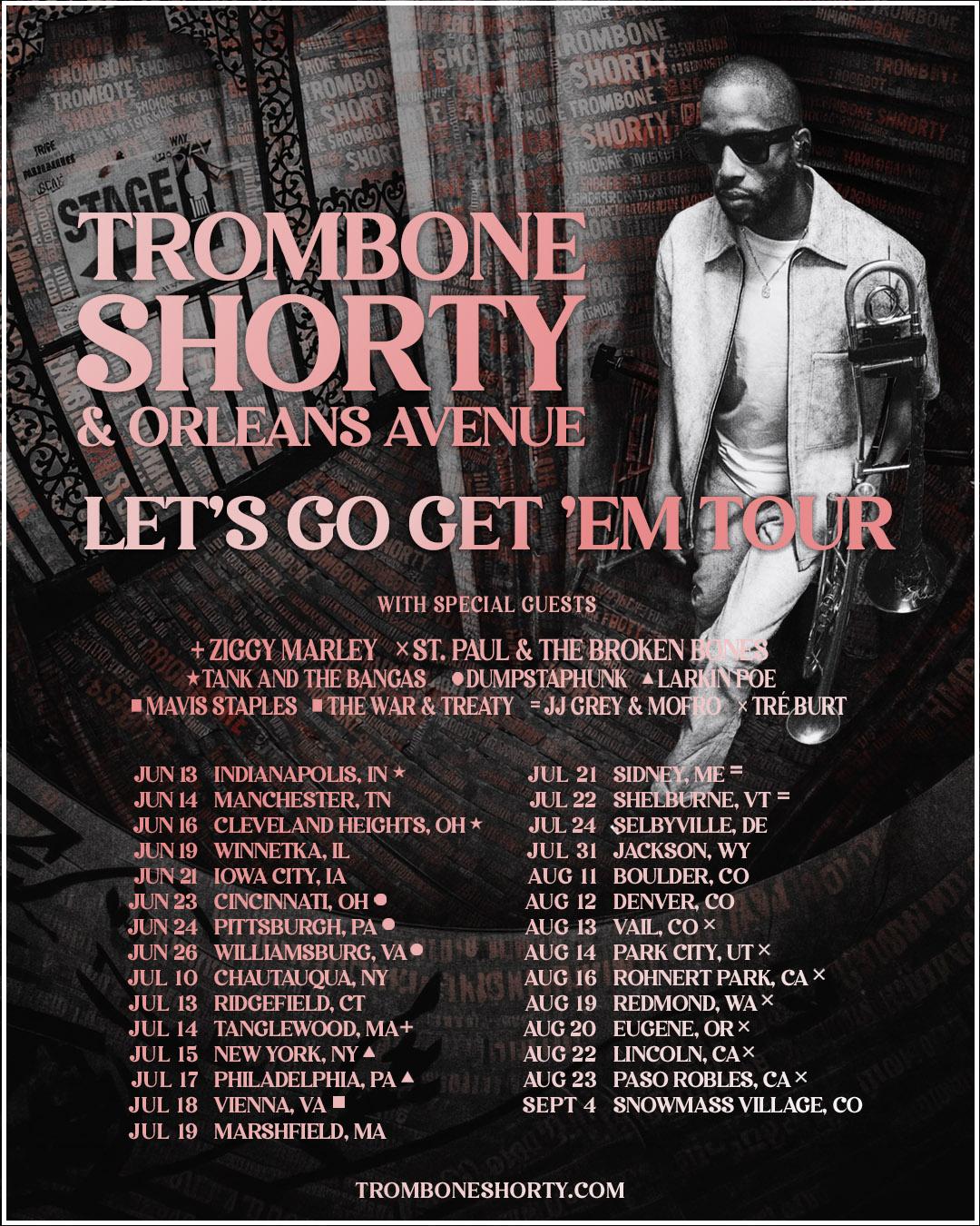 February 23, 2026 // New Orleans powerhouse Trombone Shorty & Orleans Avenue will hit the road this summer with a major run of 2026 tour dates. Today, the band announced an extensive run of 2026 summer tour dates, featuring a mix of highly anticipated festival appearances, the "Let's Go Get 'Em Tour" (Indianapolis through Denver) and a special co-headlining West Coast run billed as "Trombone Shorty & Orleans Avenue and St. Paul & The Broken Bones" (Colorado through California and the Pacific Northwest). The summer routing also features an incredible roster of special guests and support acts, including Mavis Staples, Tank and The Bangas, Dumpstaphunk, Larkin Poe, The War and Treaty, JJ Grey & Mofro, and Tré Burt.