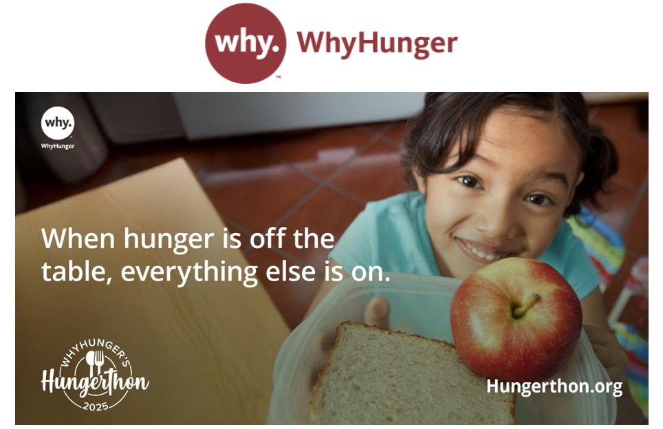 For four decades, WhyHunger’s Hungerthon has been an engine powering community solutions to hunger that work. For more information, visit Hungerthon.org and follow the conversation on social media using #Hungerthon.