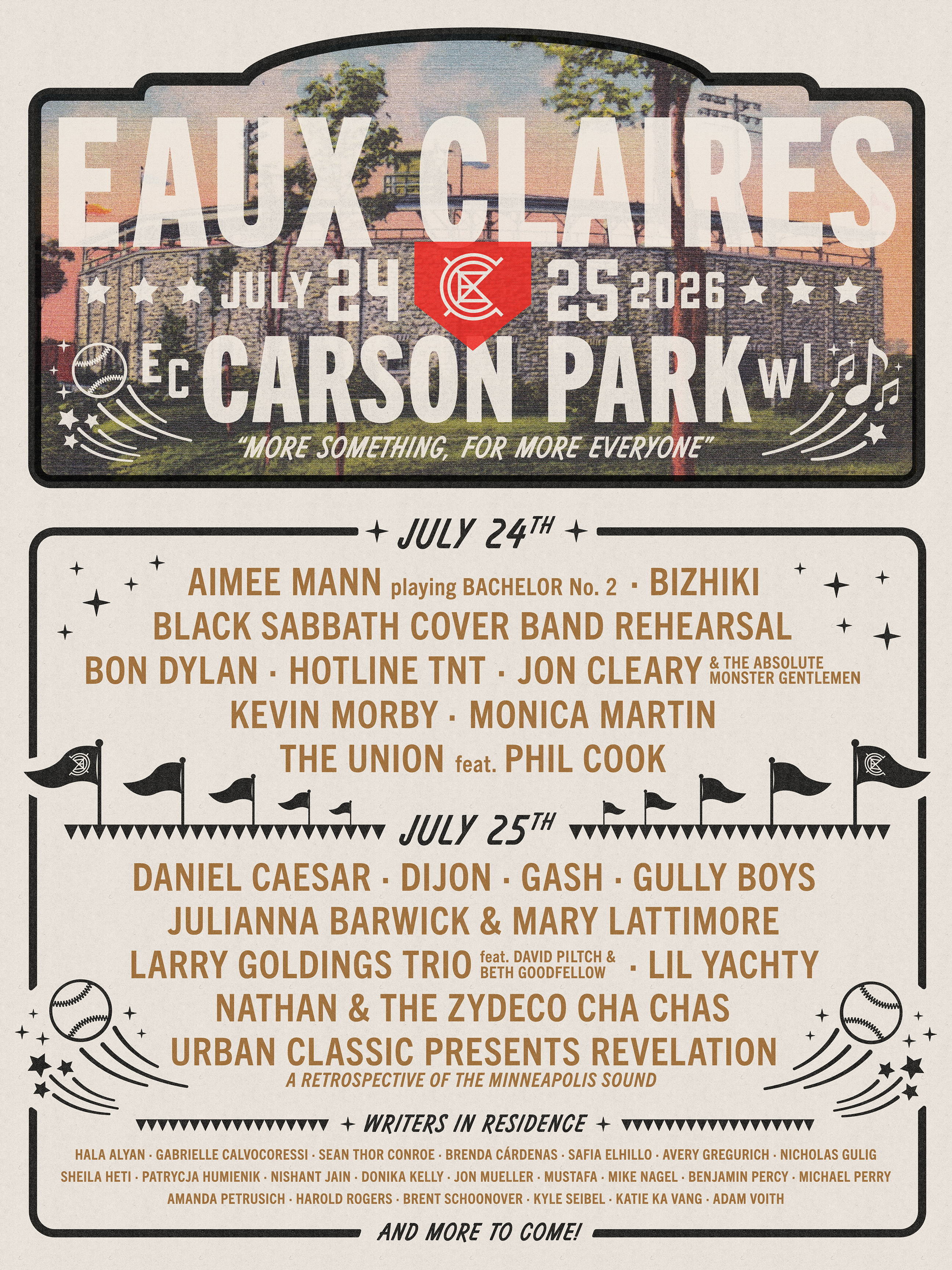 Curated by Bon Iver, and originally founded by Bon Iver's Justin Vernon and The National's Aaron Dessner, at the heart of Eaux Claires Festival 2026 is music. But along with our incredible roster of musicians, the Eaux Claires bullpen will feature our inaugural class of Writers In Residence, presenting readings, discussions and collaborations from some of the most intriguing names in the literary world: Michael Perry, Sheila Heti, Hala Alyan, Sean Thor Conroe, Kyle Seibel, Amanda Petrusich, Jon Mueller, Nicholas Gulig, Harold Rogers, Mike Nagel, Benjamin Percy, Nishant Jain, Mustafa, Safia Elhillo, Patrycja Humienik, Brent Schoonover, Gabrielle Calvocoressi, Brenda Cárdenas, Katie Ka Vang, Adam Voith, Avery Gregurich and Donika Kelly. Visit eauxclaires.com for daily lineups and additional details.